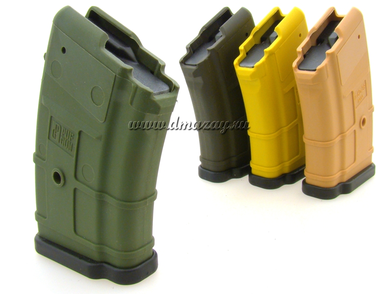 Вставляется в приёмник (горловину), который снабжен защелкой с предохранительной скобой, предотвращающей случайное извлечение магазина. Магазин имеет выход в два ряда, что повышает безотказность действия и упрощает наполнение магазина.
