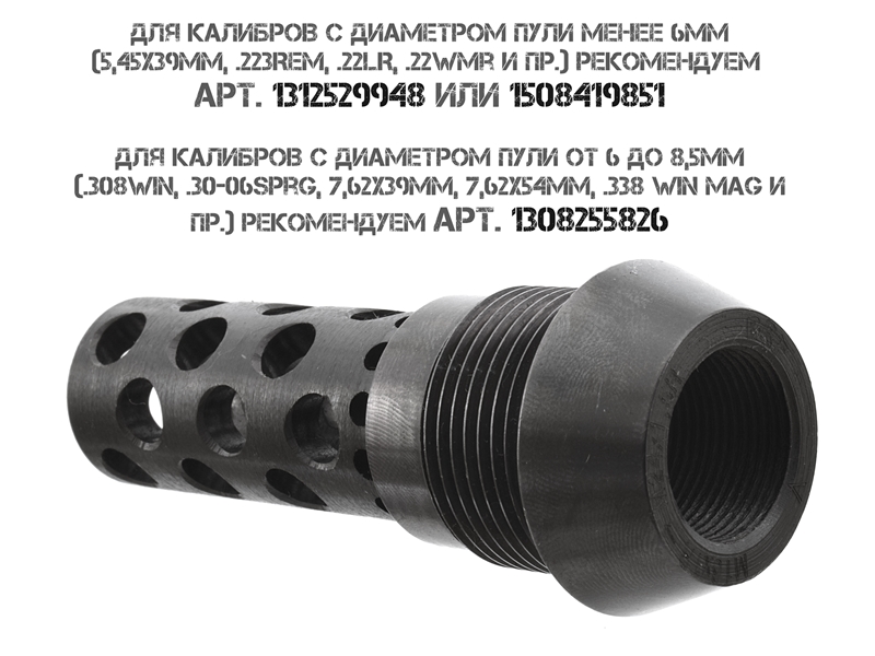 Для калибров с диаметром пули от 6 до 8,5мм (.308win, .30-06sprg, 7,62х39мм, 7,62х54мм, .338 win mag и пр.) - "ДТКП (Банка) + термочехол Сайга-308 исп.46, Сайга-МК исп.030/036 7,62х39мм, 17 камер M24x1,5R, BRT (Брт)".