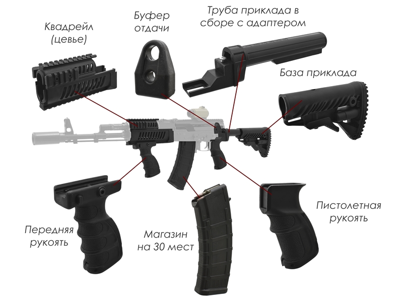| Цена за: | 1 комплект: Приклад (база, корпус приклада), труба приклада в сборе с адаптером, цевье (квадрейл), передняя тактическая рукоять на планку Вивера, пистолетная рукоять, магазин (рожок), буфер отдачи (демпфер) |