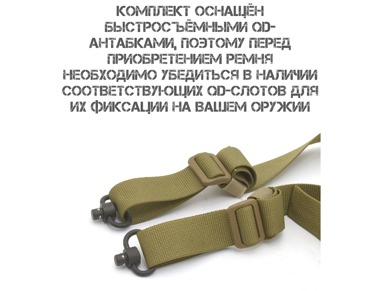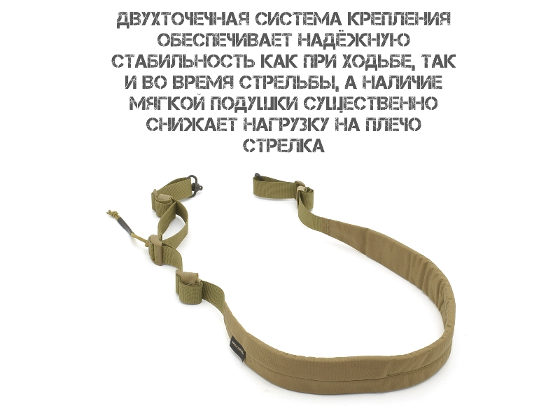 Инновационная конструкция с двухточечной системой крепления гарантирует стабильную фиксацию оружия в любом положении. Интегрированные QD-антабки позволяют быстро устанавливать и снимать ремень, а специальная система регулировки даёт возможность мгновенно переводить ремень из походного положения в рабочее — это критически важно в динамичных ситуациях. Камуфляжный окрас «койот» обеспечивает эффективную маскировку в природных условиях.