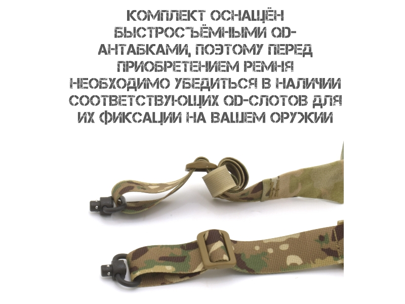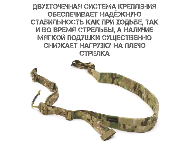 Универсальная конструкция с двухточечной системой крепления гарантирует надёжную фиксацию оружия в любых условиях применения. Интегрированные QD-антабки позволяют осуществлять быструю установку и демонтаж ремня, а инновационная система регулировки обеспечивает мгновенный переход из походного положения в боевое — что критически важно в условиях реального применения. Камуфляжная расцветка Multicam обеспечивает эффективную маскировку в различных типах местности.