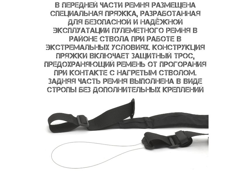 Уникальная конструкция включает специальную пряжку с негорючим стальным тросом, разработанную для эксплуатации в экстремальных условиях. Пряжка, изготовленная из прочного алюминия, обеспечивает надёжную фиксацию ремня в районе горячего ствола, защищая его от прогорания. Система крепления позволяет быстро устанавливать и снимать пряжку, адаптируя оружие под конкретные задачи.