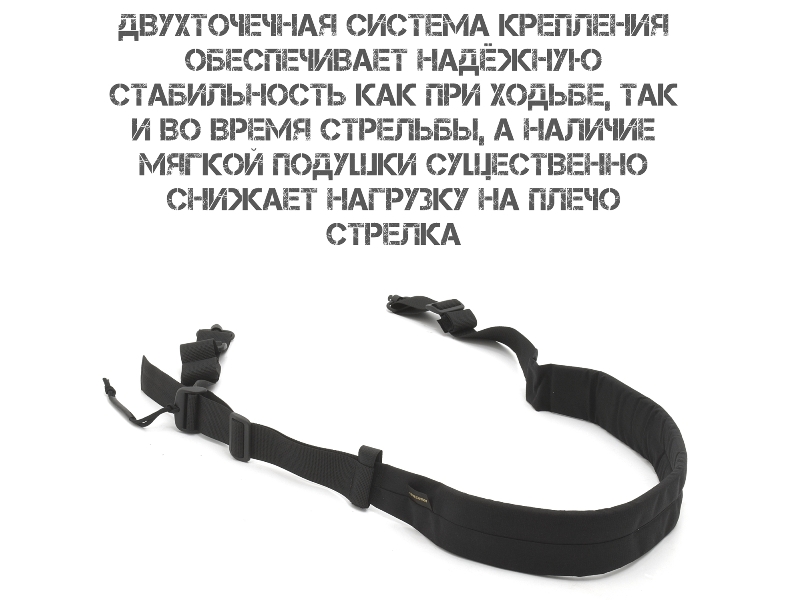 Продуманная конструкция с двухточечной системой крепления гарантирует надёжную фиксацию оружия в любом положении. Интегрированные QD-антабки обеспечивают моментальную установку и снятие ремня, а специальная система регулировки позволяет мгновенно переводить ремень из походного положения в рабочее — что критически важно при выполнении снайперских задач.