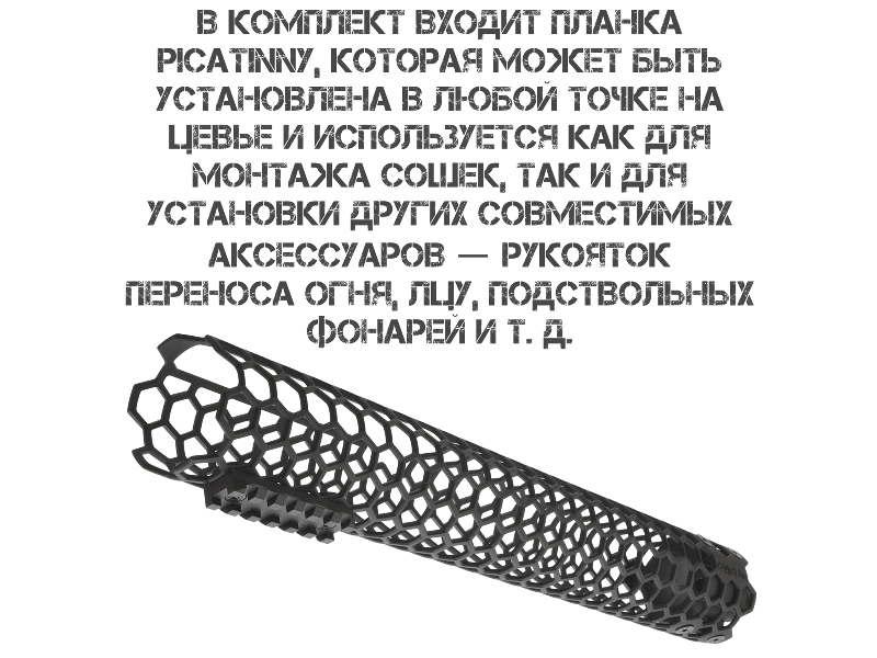 Съемная планка Пикатини/Вивера: позволяет устанавливать оптические сошки, лазерные целеуказатели, тактические фонари и иное оборудование.