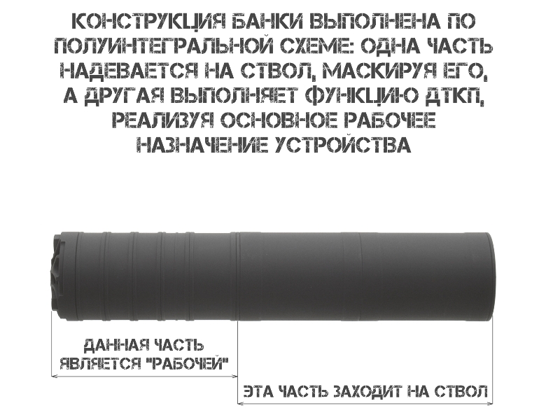Полуинтегральная конструкция: заходит на ствол на 138 мм и удлиняет его на 100 мм, скрывая ствол до стойки мушки — это повышает эстетику оружия и обеспечивает дополнительную защиту.
