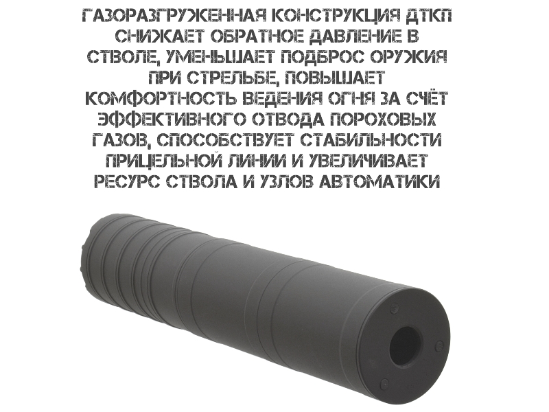 Значительное снижение шума: уменьшает звуковое давление на ~25–30 дБ, снижая нагрузку на органы слуха и маскируя позицию стрелка.