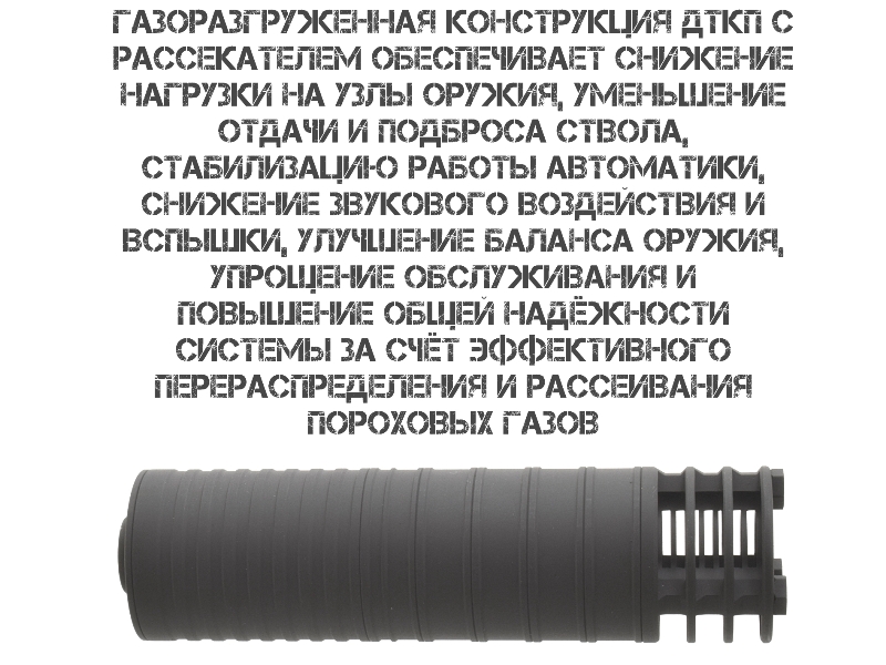 Особая конструкция с двухконтурной передней крышкой и рассекателем обеспечивает комплексную работу: дополнительно компенсирует отдачу, дожигает остатки пороховых газов и снижает уровень звука до 132–134 дБ на выходе.