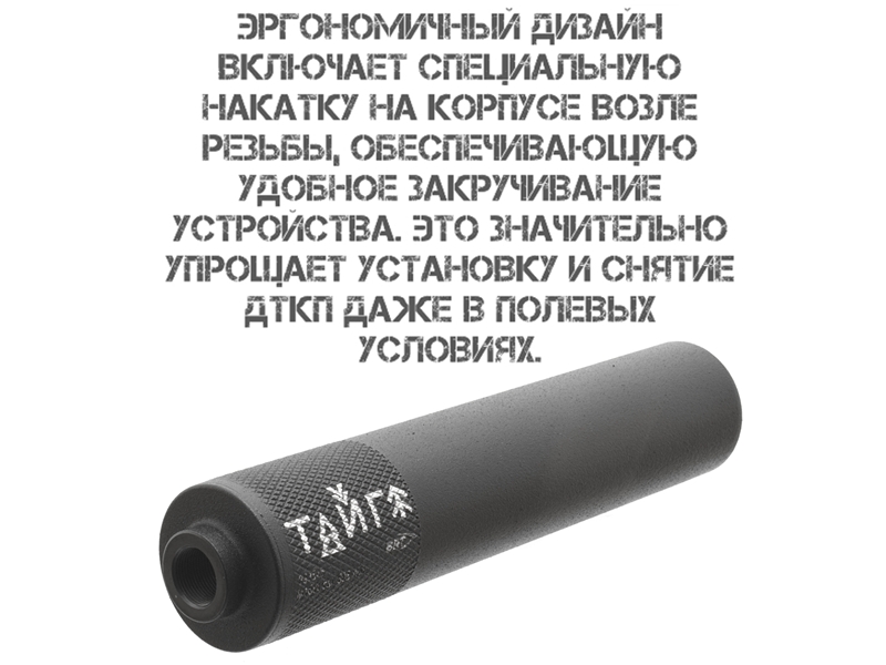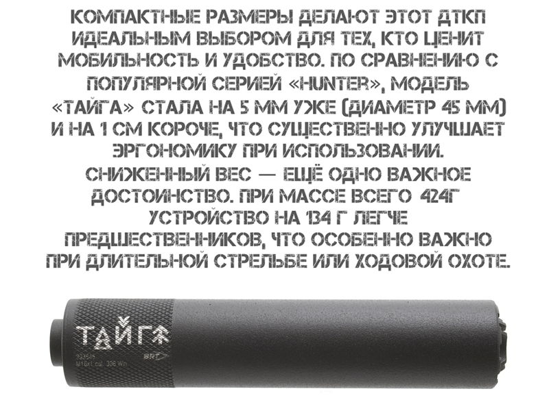 ДТКП серии «Тайга» — новейшая разработка компании BRT, представляющая собой усовершенствованный глушитель закрытого типа. Устройство создано с учётом последних технологических достижений в области оружейной акустики.