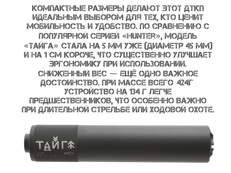 ДТКП серии «Тайга» — новейшая разработка компании BRT, представляющая собой усовершенствованный глушитель закрытого типа. Устройство создано с учётом последних технологических достижений в области оружейной акустики.