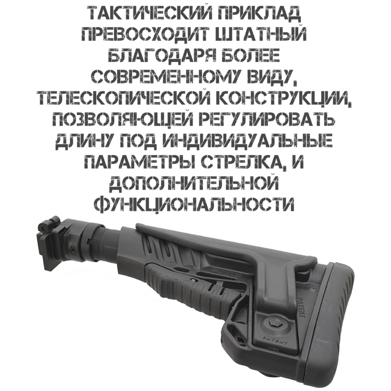Повышение эргономики: завышенная ось, точная регулировка длины и регулируемый подщечник обеспечивают комфортную вкладку и естественное положение головы стрелка при работе с оптическими, коллиматорными, ночными и тепловизионными прицелами.