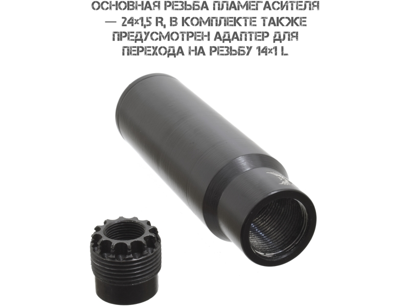 Универсальность крепления — в комплекте идёт переходник с резьбой 14×1 L, а изделие совместимо с резьбой 24×1,5 r, что расширяет спектр совместимого оружия.