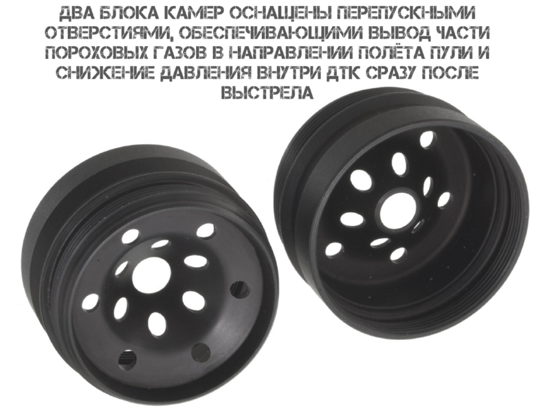 Перепускные отверстия в камерах направляют часть газов вперёд по ходу пули, снижая давление внутри устройства.