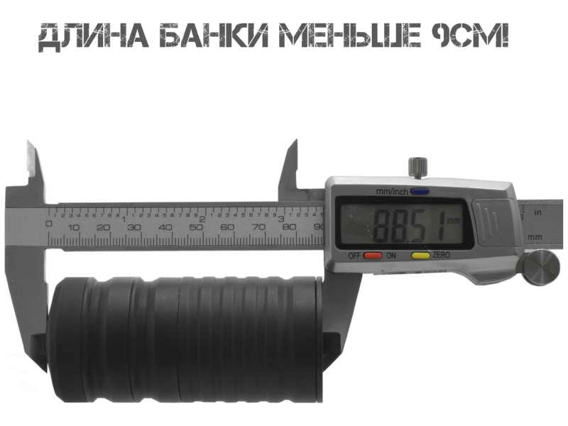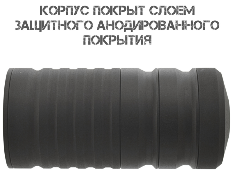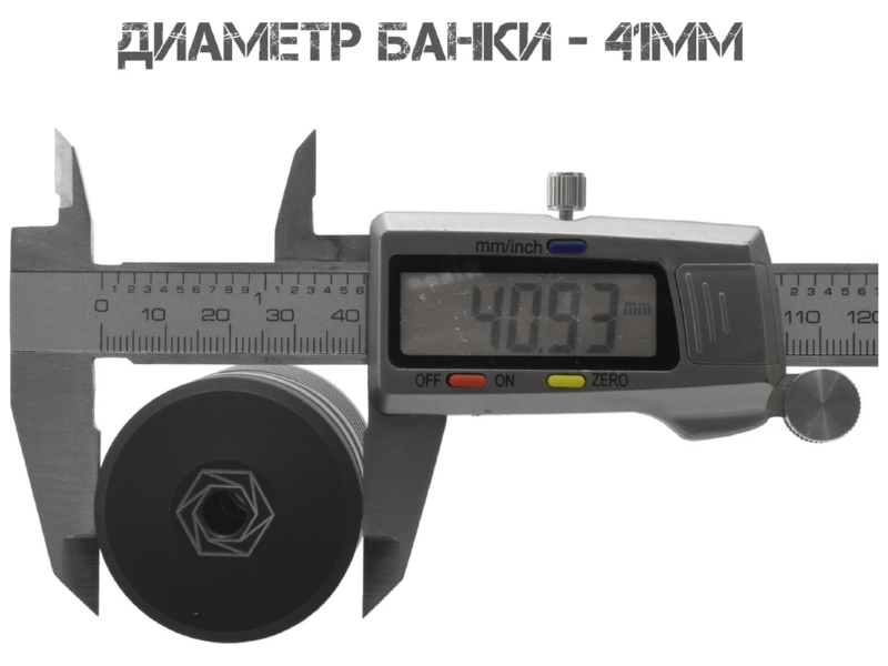 Увеличенный диаметр (41 мм) при относительно небольшой длине (8,85 см) создаёт достаточный внутренний объём для эффективного снижения давления и звука.