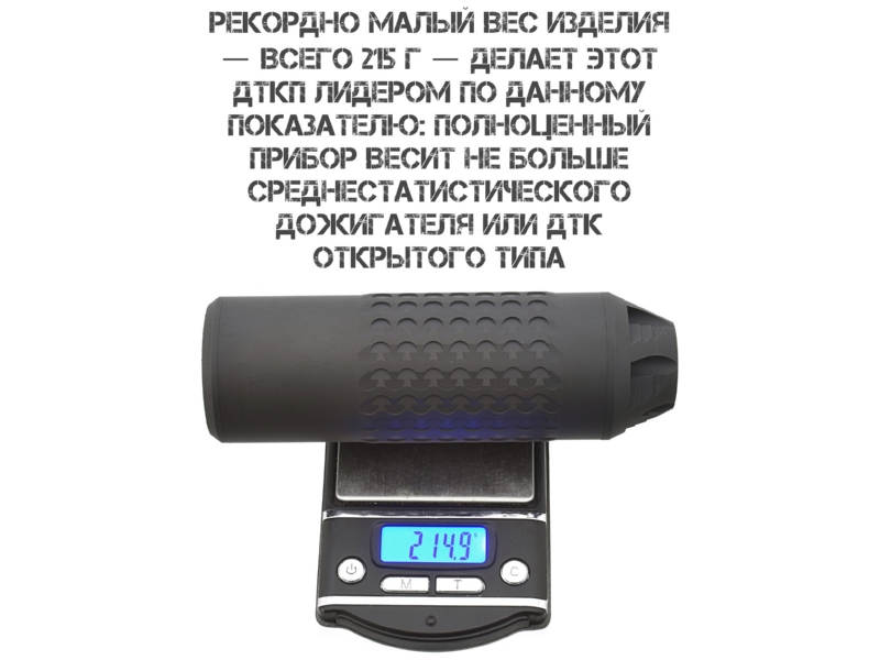 • Рекордно малый вес: всего 215 г — легче многих дожигателей и ДТК открытого типа.