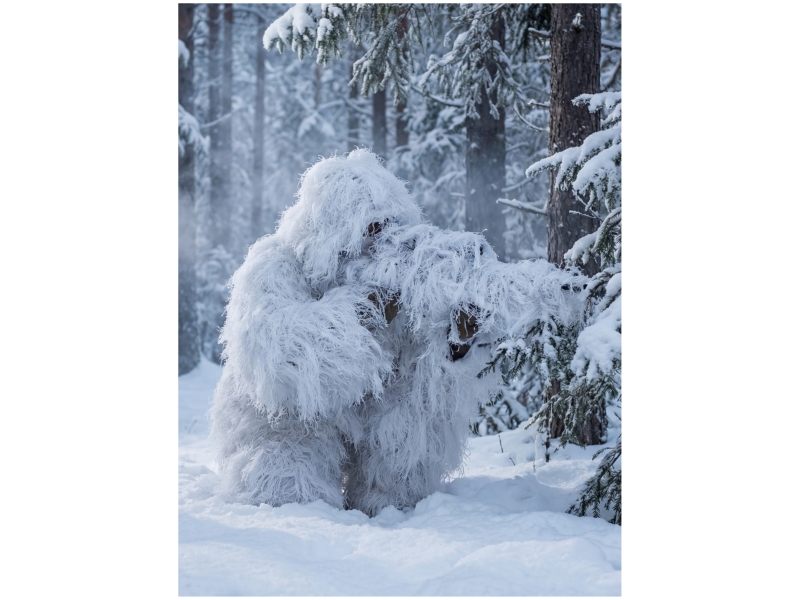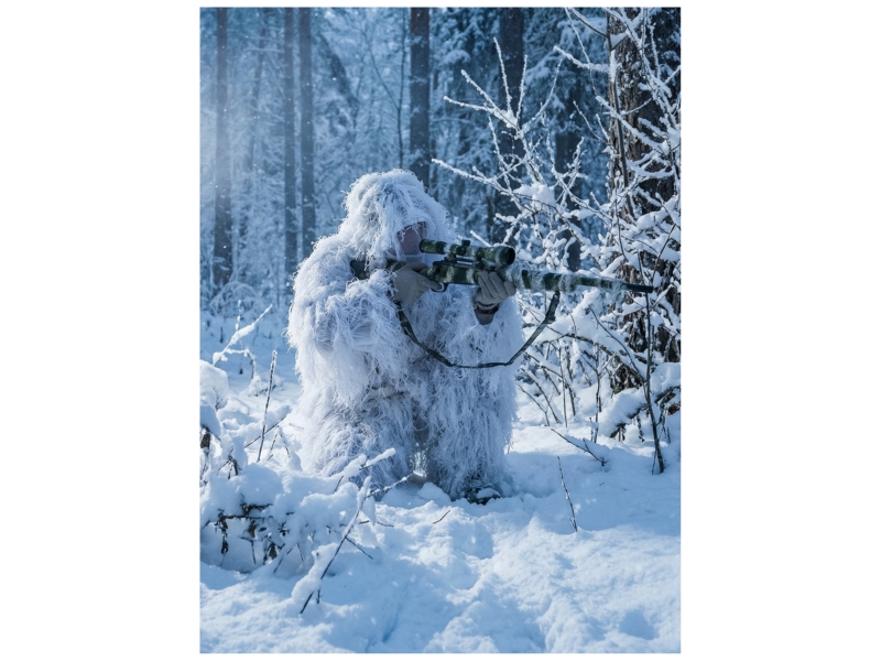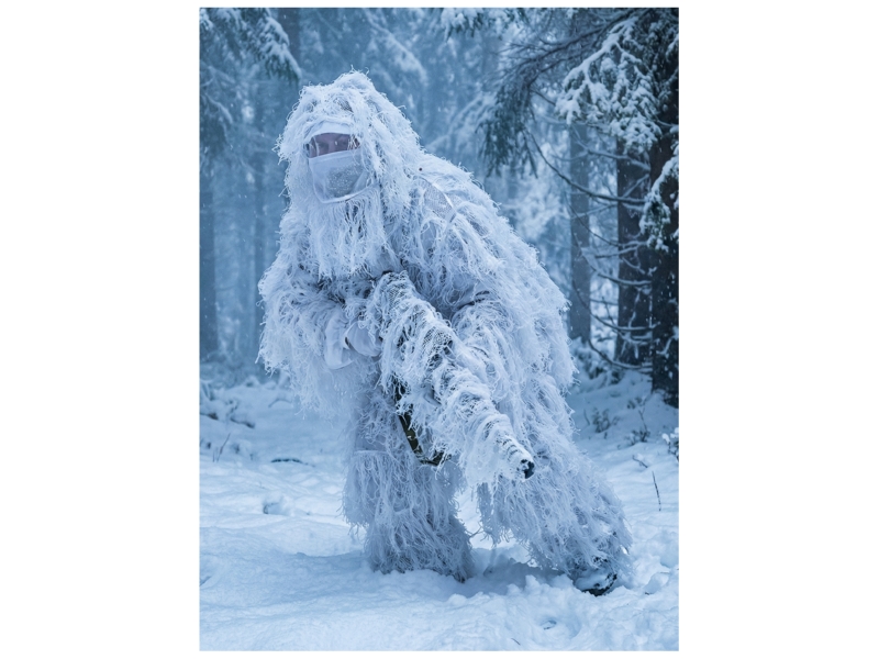Выбирайте позицию на заснеженном участке с естественными неровностями (сугробы, кусты под снегом) — так костюм максимально реализует свой маскировочный потенциал.