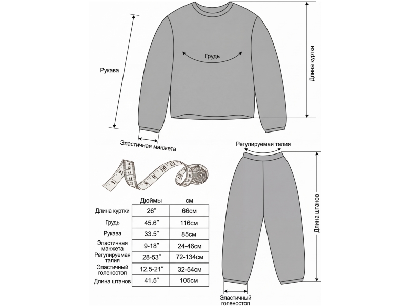 талия брюк (регулируемая) — 72–134 см;