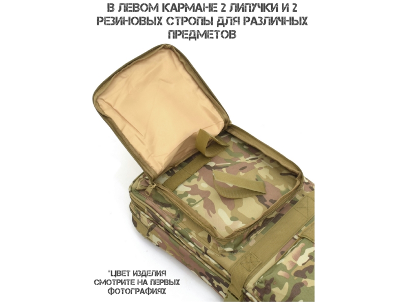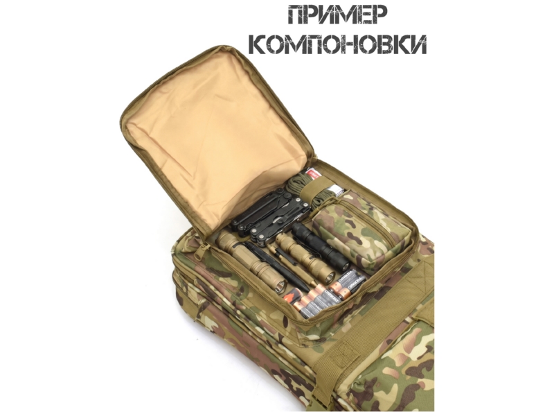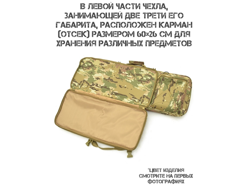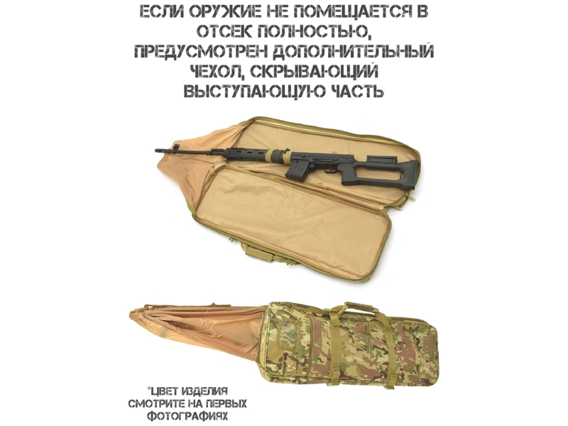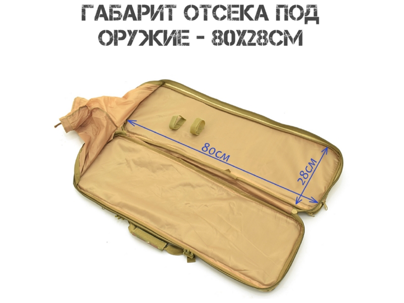 Основной отсек (80×28 см): предназначен для оружия. Внутри — две липучки для надёжной фиксации. Если оружие длиннее 80 см, используется вшитый чехол чулок: он надевается на выступающую часть, затягивается шнуром и полностью скрывает оружие.