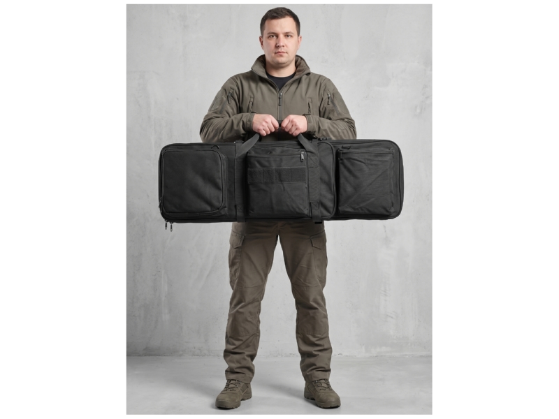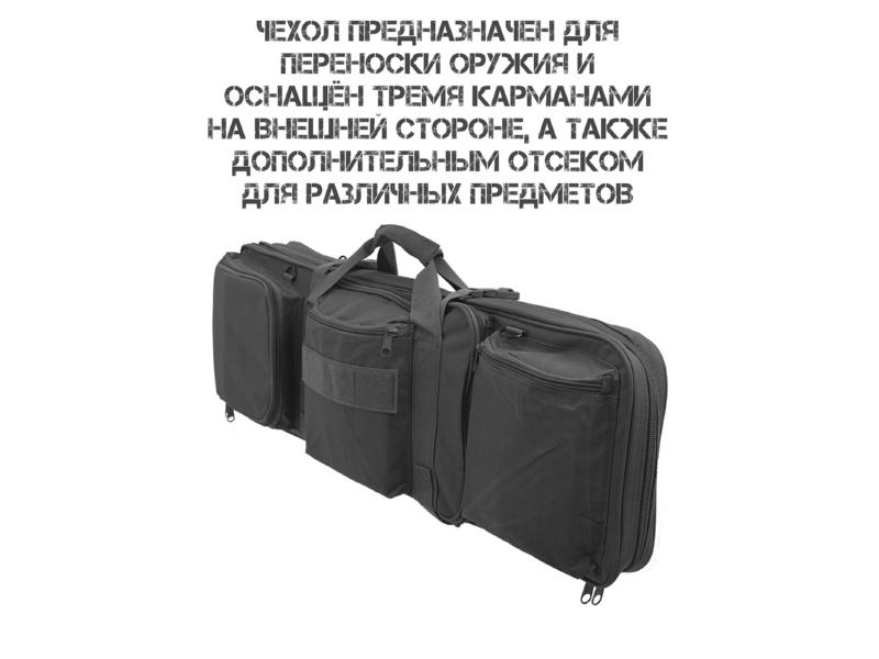 Основной отсек (80×28 см): предназначен для оружия. Внутри предусмотрены две липучки для надёжной фиксации. Если оружие длиннее 80 см, используется вшитый чехол чулок: он надевается на выступающую часть, затягивается шнуром и полностью скрывает оружие.