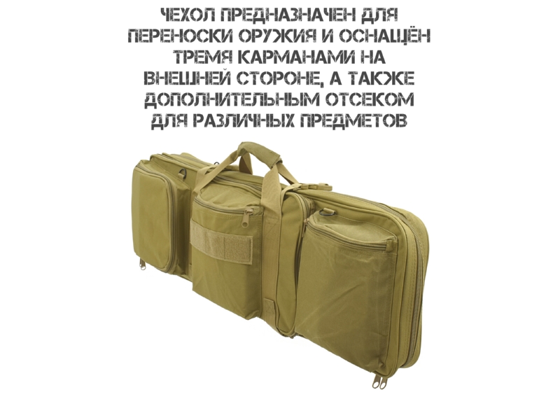 Основной отсек (80×28 см): предназначен для оружия. Внутри предусмотрены две липучки для надёжной фиксации. Если оружие длиннее 80 см, используется вшитый чехол чулок: он надевается на выступающую часть, затягивается шнуром и полностью скрывает оружие.