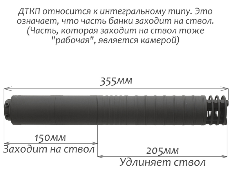 Монтаж: заходит на ствол на 150 мм, удлиняет ствол на 205 мм.