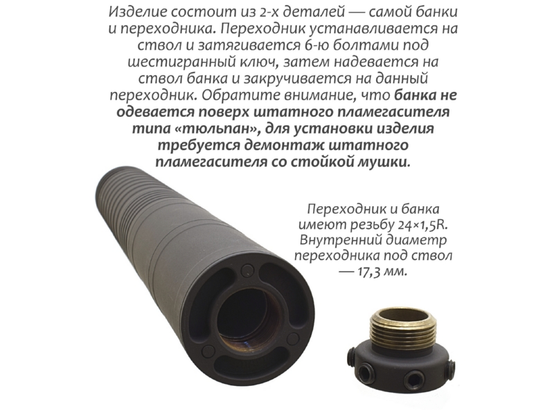 Для снятия устройства достаточно просто открутить его со ствола. Переходник остаётся закреплённым на оружии. Последующие операции по снятию и установке выполняются быстро — за считанные секунды. Это удобно при необходимости оперативного обслуживания или смены конфигурации оружия.