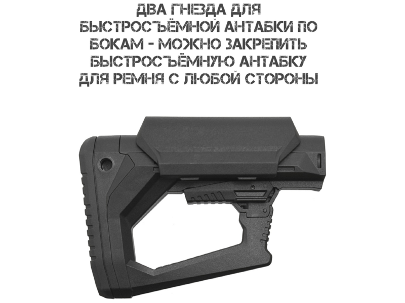 Два гнезда для быстросъёмной антабки. По бокам приклада предусмотрены гнёзда, позволяющие закрепить ремень с любой стороны — выбор зависит от предпочтений стрелка и специфики задач.