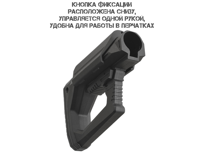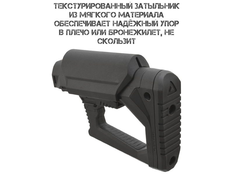 Текстурированный затыльник. Изготовлен из мягкого нескользящего материала, обеспечивает надёжный упор в плечо или бронежилет, снижает отдачу и повышает комфорт при стрельбе.