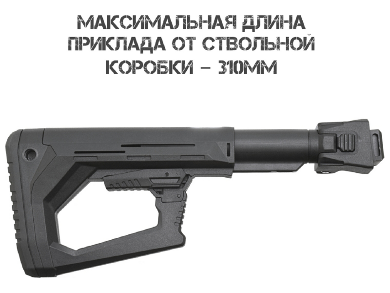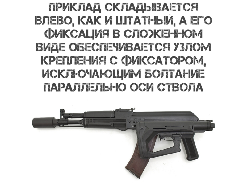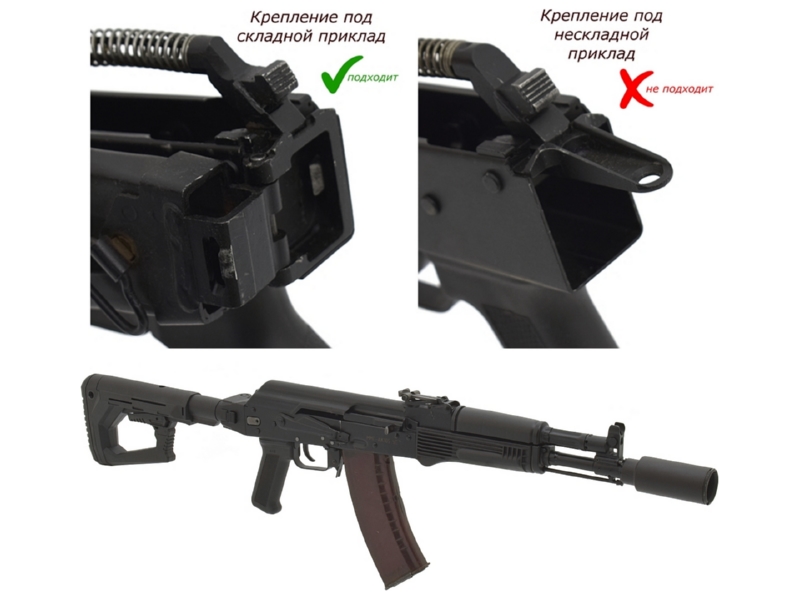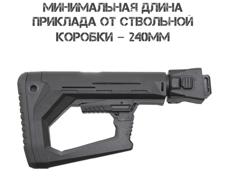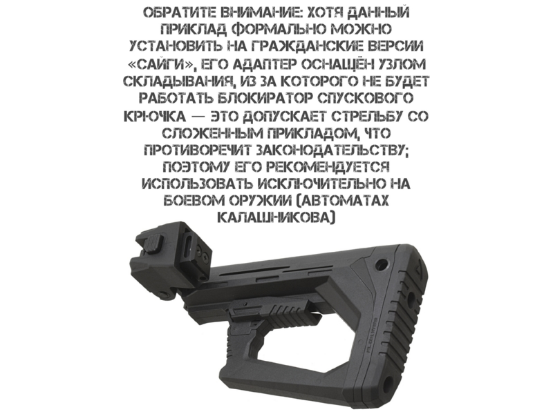 Только для служебного оружия! В конструкции отсутствует отверстие под блокиратор (согласно ФЗ «Об оружии»), что позволяет стрелять со сложенным прикладом. Установка на гражданские версии «Сайги» формально возможна, но эксплуатация запрещена: минимальная длина оружия в боевом положении должна быть не менее 80 см.
