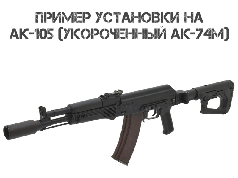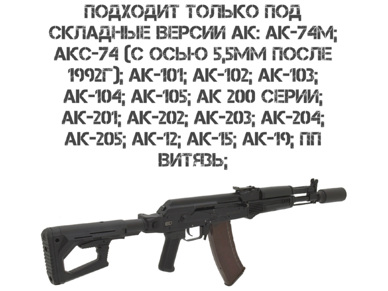 АК‑74М; АКС‑74 (с осью 5,5 мм после 1992 г.); АК‑101–АК‑105; АК 200‑й серии (АК‑201–АК‑205); АК‑12, АК‑15, АК‑19; ПП Витязь; винтовок AR‑15 (напрямую) и автоматов АК с трубками Commercial Spec или адаптером. Не совместим с АКС‑74У («Ксюха») — отличается размером штифта.