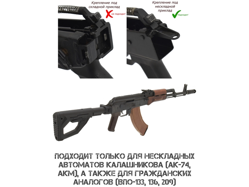 АКМ, АК 74 Внимание: установка на ряд гражданских моделей (АК 366 Ланкастер, ВПО, МА АК, КО 74, Сайга и др.) формально возможна, но может противоречить законодательству: при сложенном прикладе возможна стрельба, а длина оружия должна быть не менее 80 см. Установка на гражданское оружие осуществляется под личную ответственность владельца.