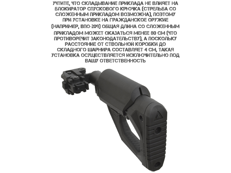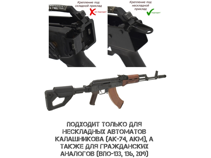 АКМ, АК 74; винтовок AR 15 (прямая установка) и автоматов АК с трубками Commercial Spec или адаптером. Внимание: установка на ряд гражданских моделей (АК 366 Ланкастер, ВПО, МА АК, КО 74, Сайга и др.) формально возможна, но может противоречить законодательству: при сложенном прикладе возможна стрельба, а длина оружия должна быть не менее 80 см. Установка на гражданское оружие осуществляется под личную ответственность владельца.
