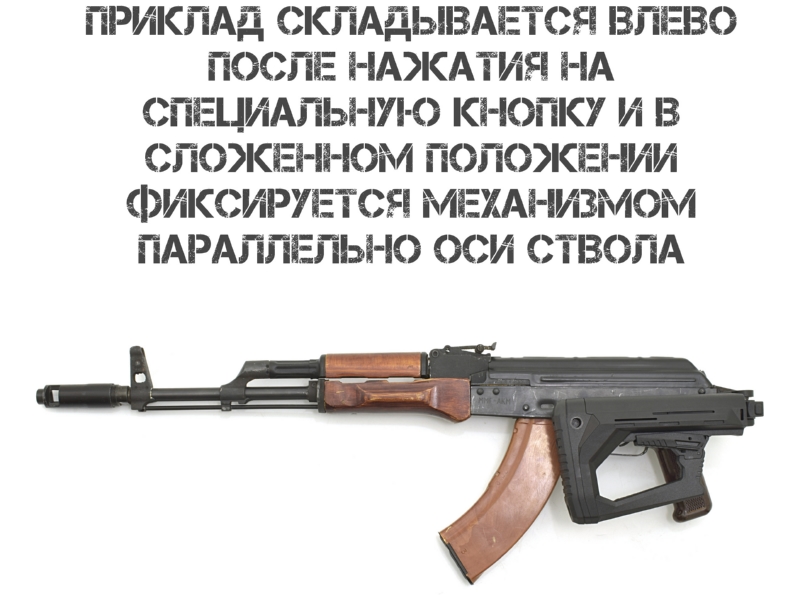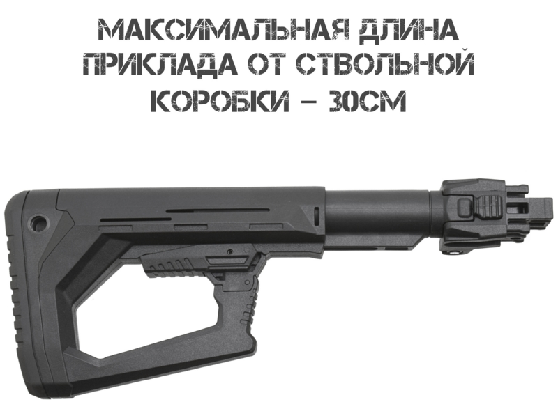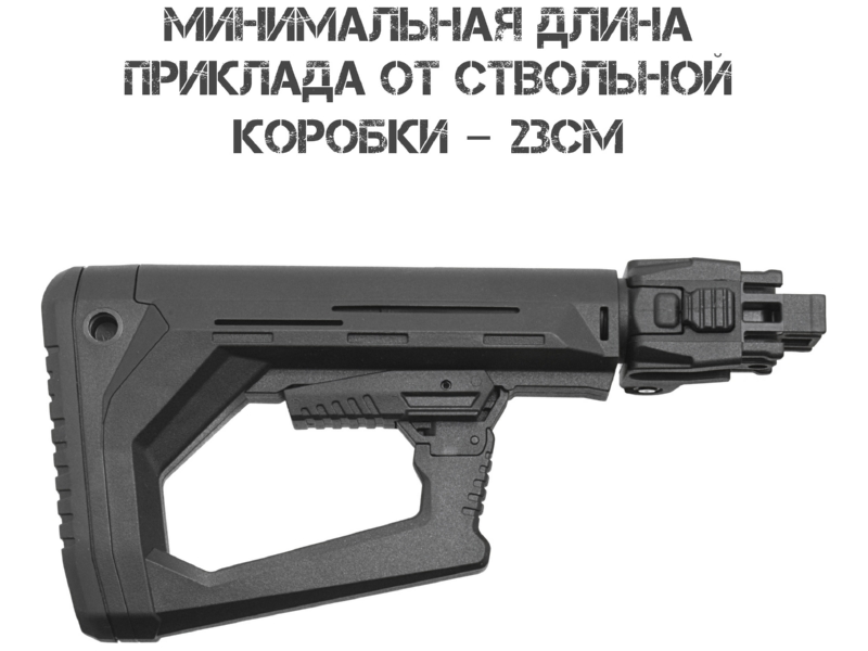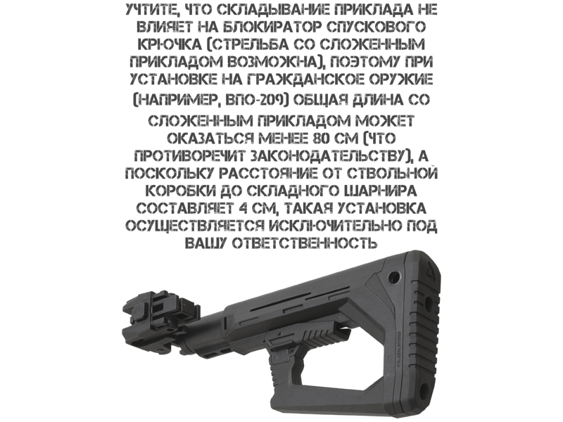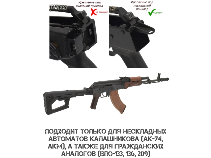 АКМ, АК 74 и автоматов АК с трубками Commercial Spec или адаптером. Внимание: установка на ряд гражданских моделей (АК 366 Ланкастер, ВПО, МА АК, КО 74, Сайга и др.) формально возможна, но может противоречить законодательству: при сложенном прикладе возможна стрельба, а длина оружия должна быть не менее 80 см. Установка на гражданское оружие осуществляется под личную ответственность владельца.